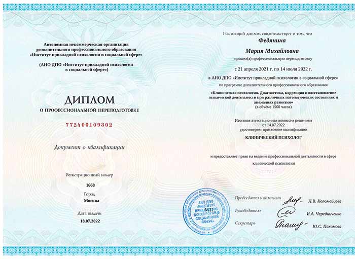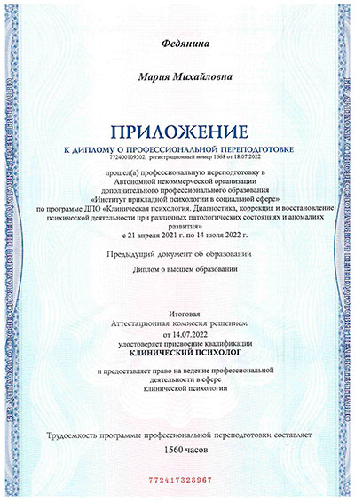 2022 г. – АНО ДПО Институт прикладной психологии в социальной сфере по программе «Диагностика, коррекция и восстановление психической деятельности при различных патологических состояниях и аномалиях развития», клиническая психология.